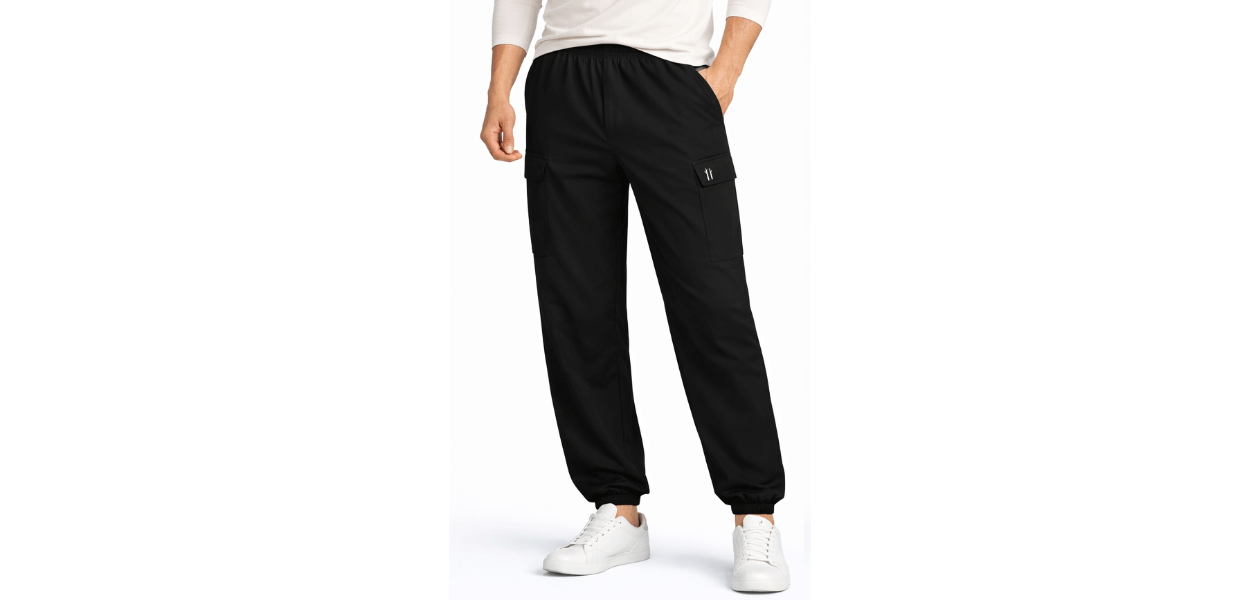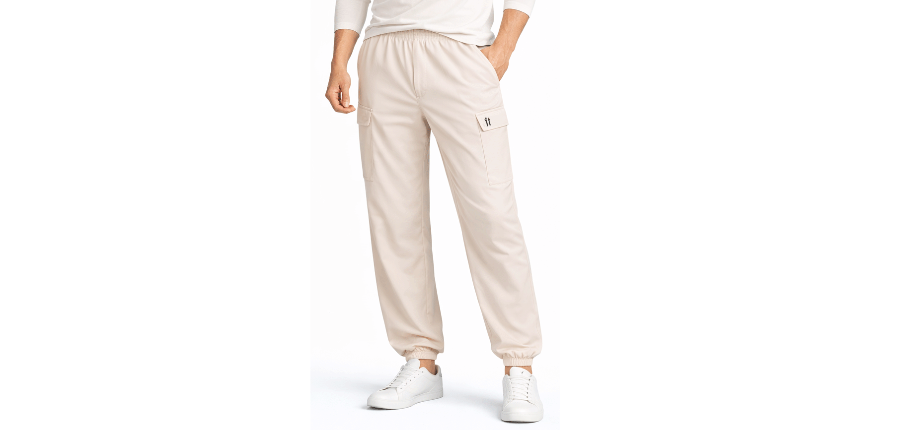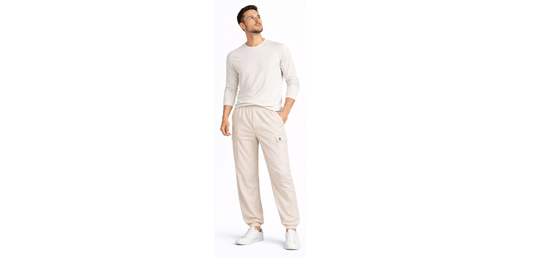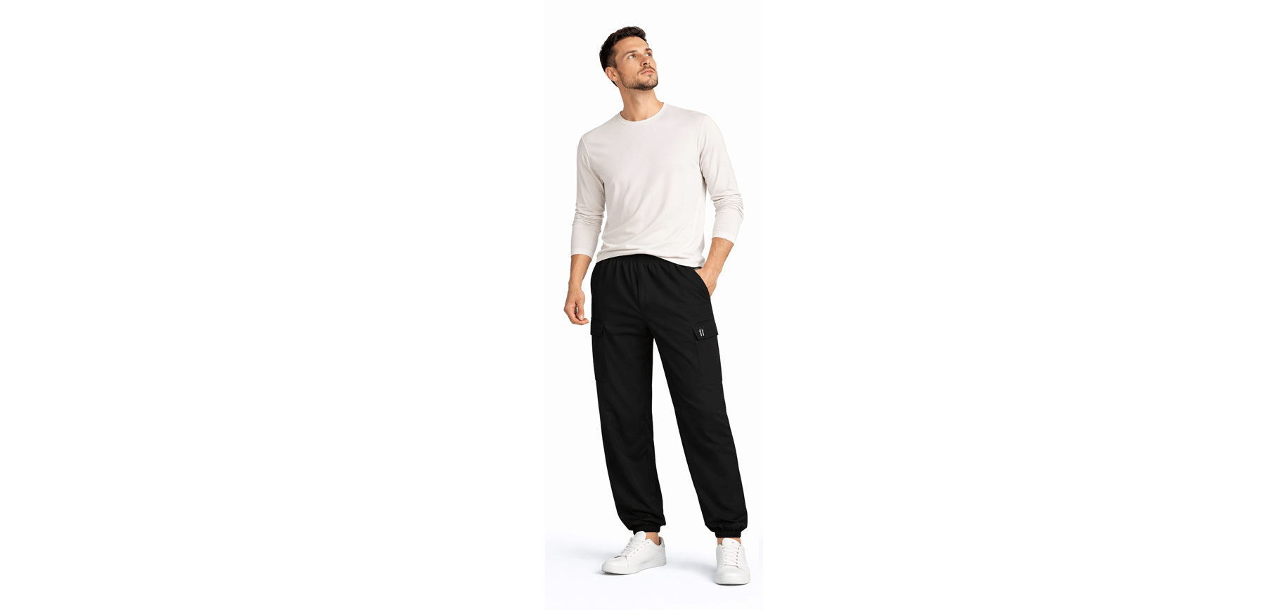Designed with a minimalist yet functional approach, the joggers include discreet invisible slash pockets for a clean aesthetic and practical cargo pockets for added storage. The elastic waistband provides a flexible and secure fit, while cuffed ankles create a modern tapered finish that enhances the overall style.